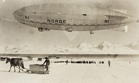 "Norge" over Ny-Ålesund ved avreisen mot Nordpolen, mai 1926. Via Nasjonalbiblioteket på Flickr.